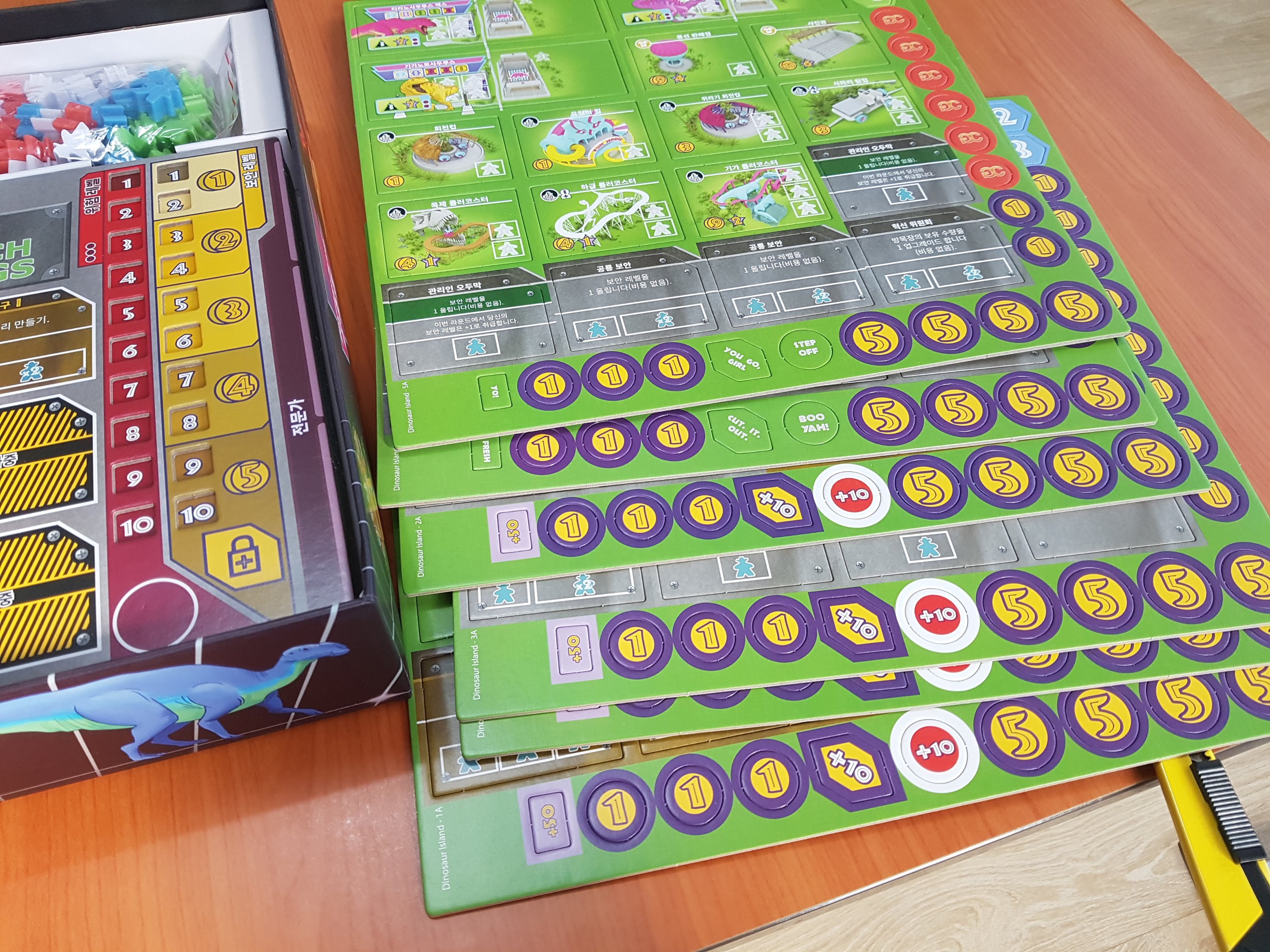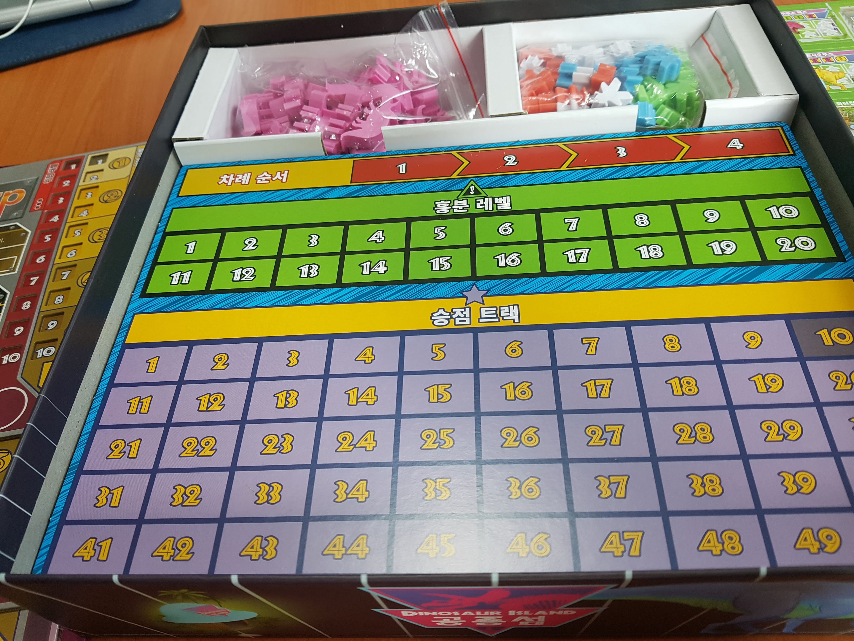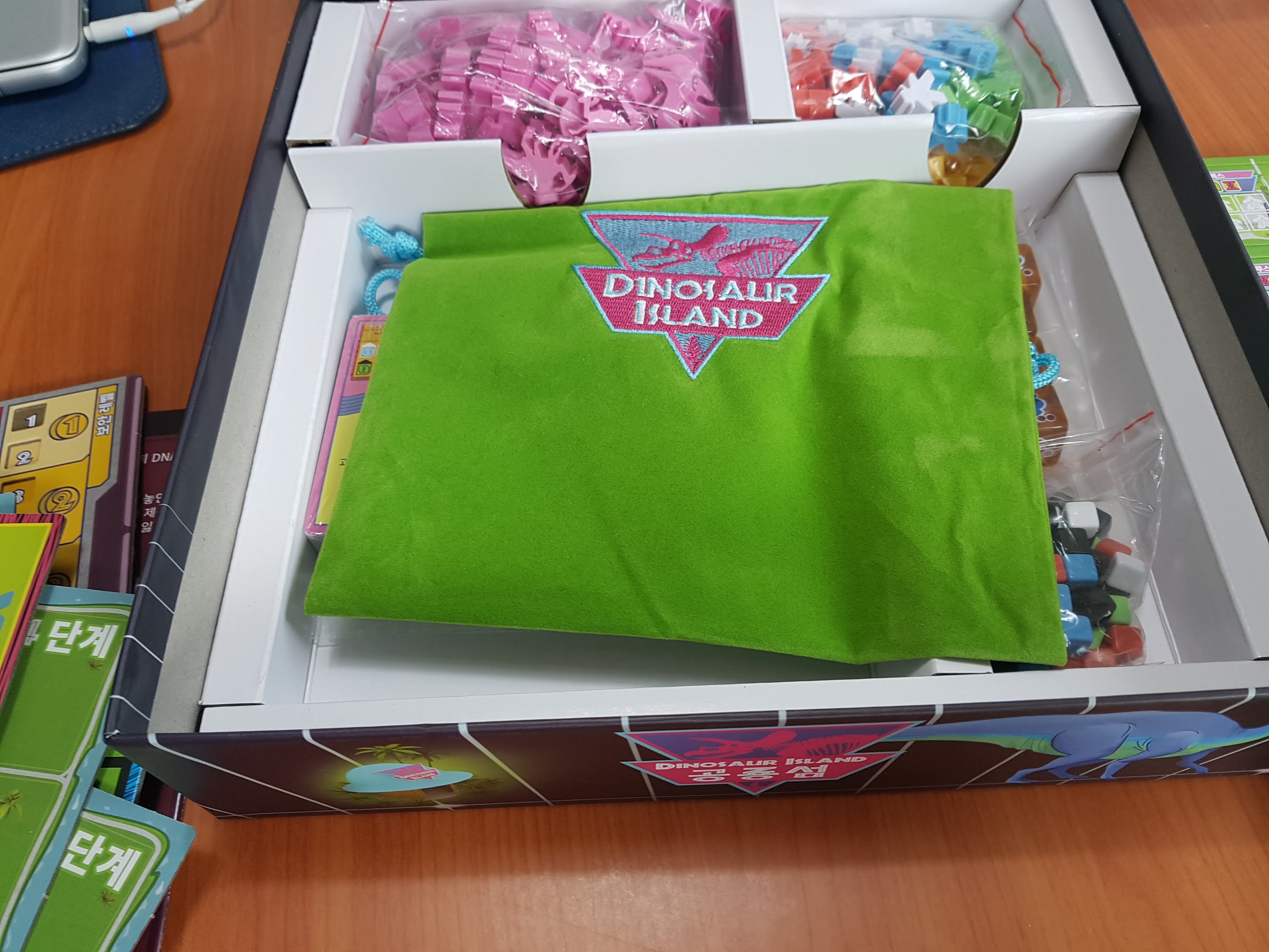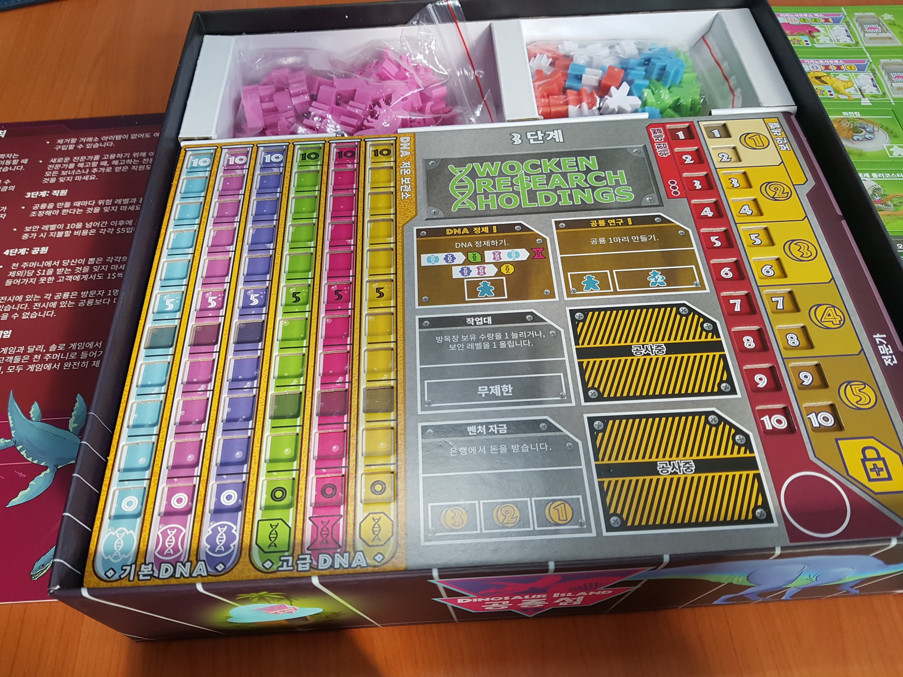 카드와 주사위 미플들이 보입니다. 기본공룡은 빼고 프로모 공룡을 넣었습니다. 둘다 넣으면 안들어갑니다.