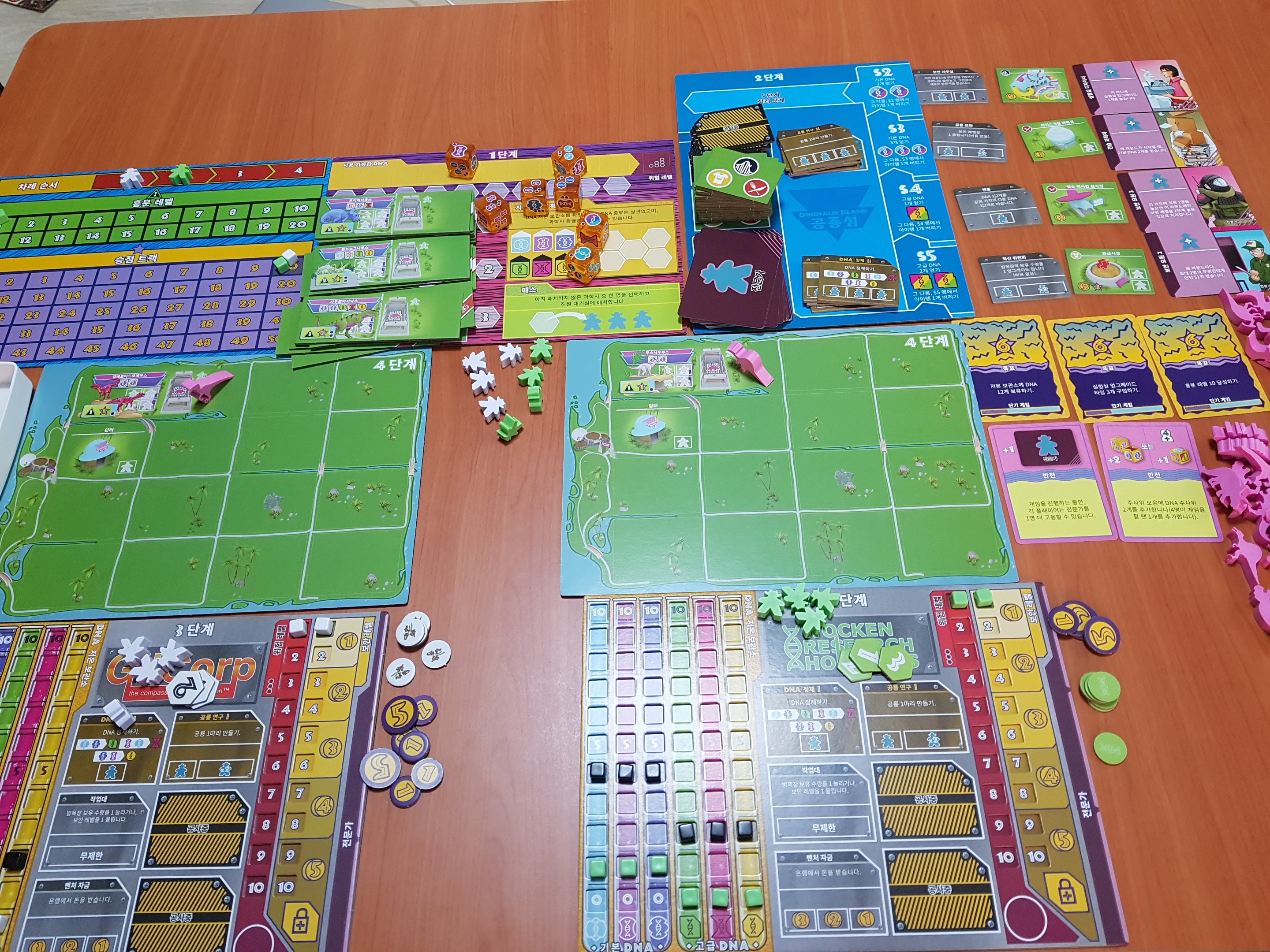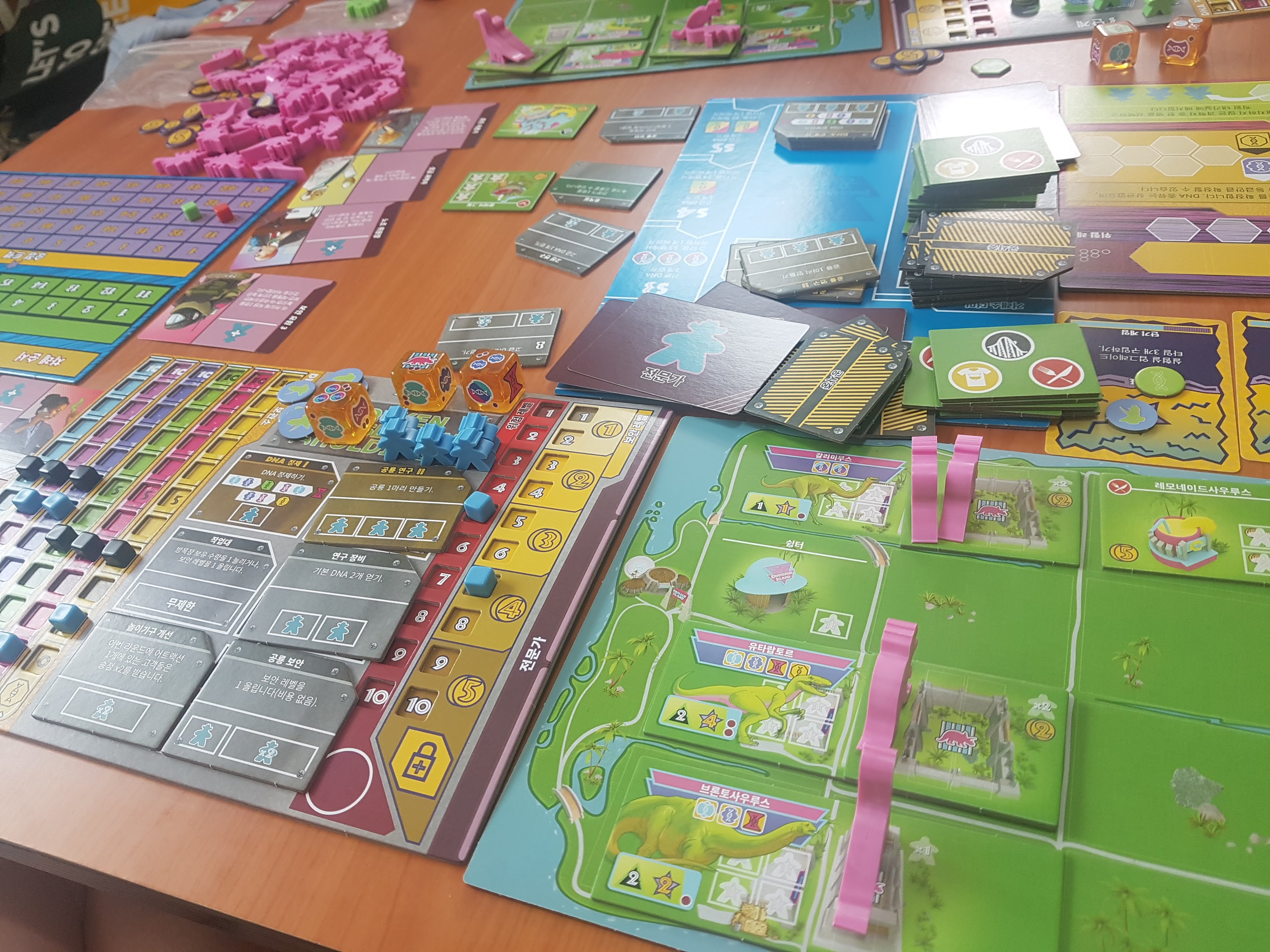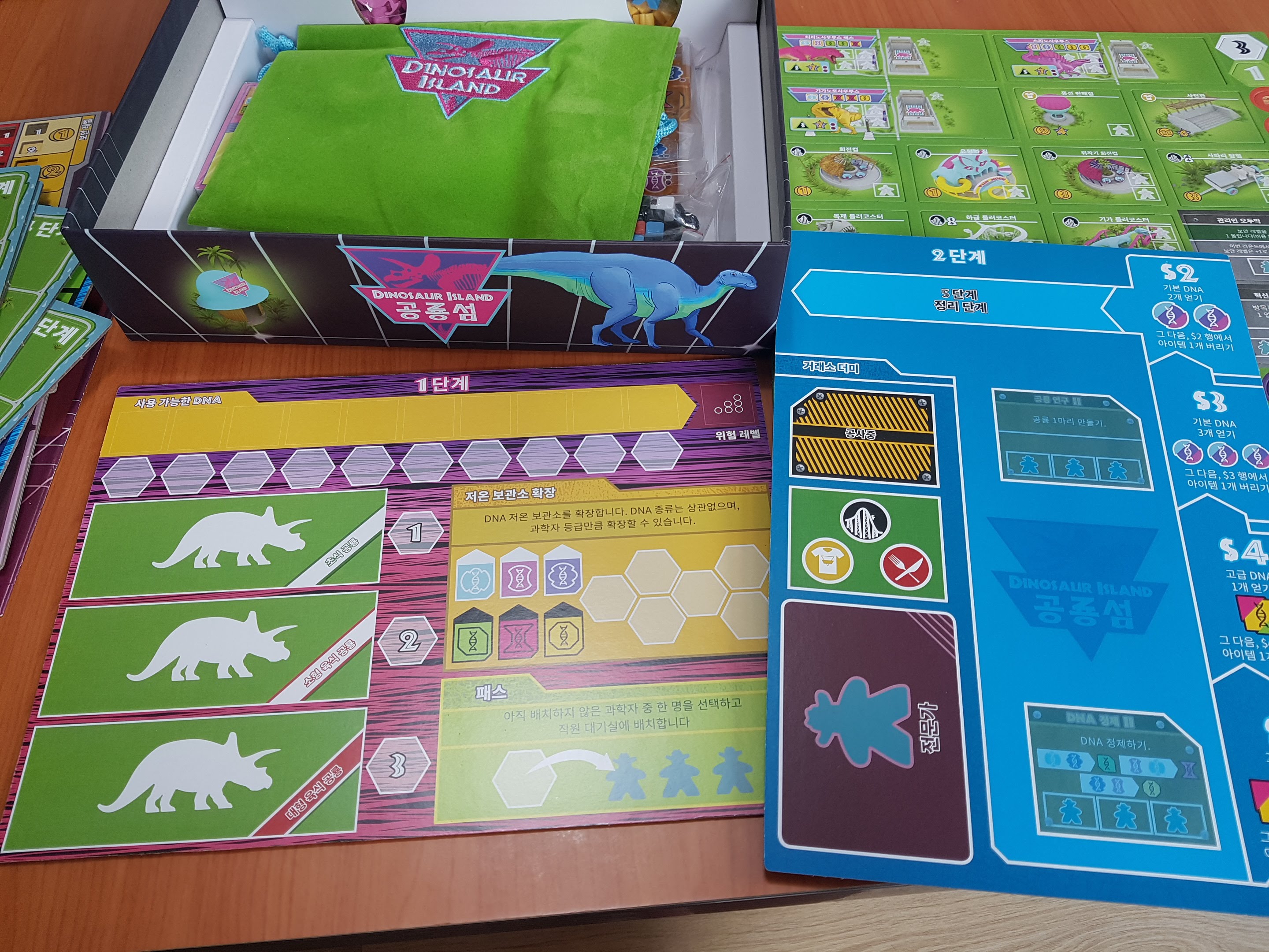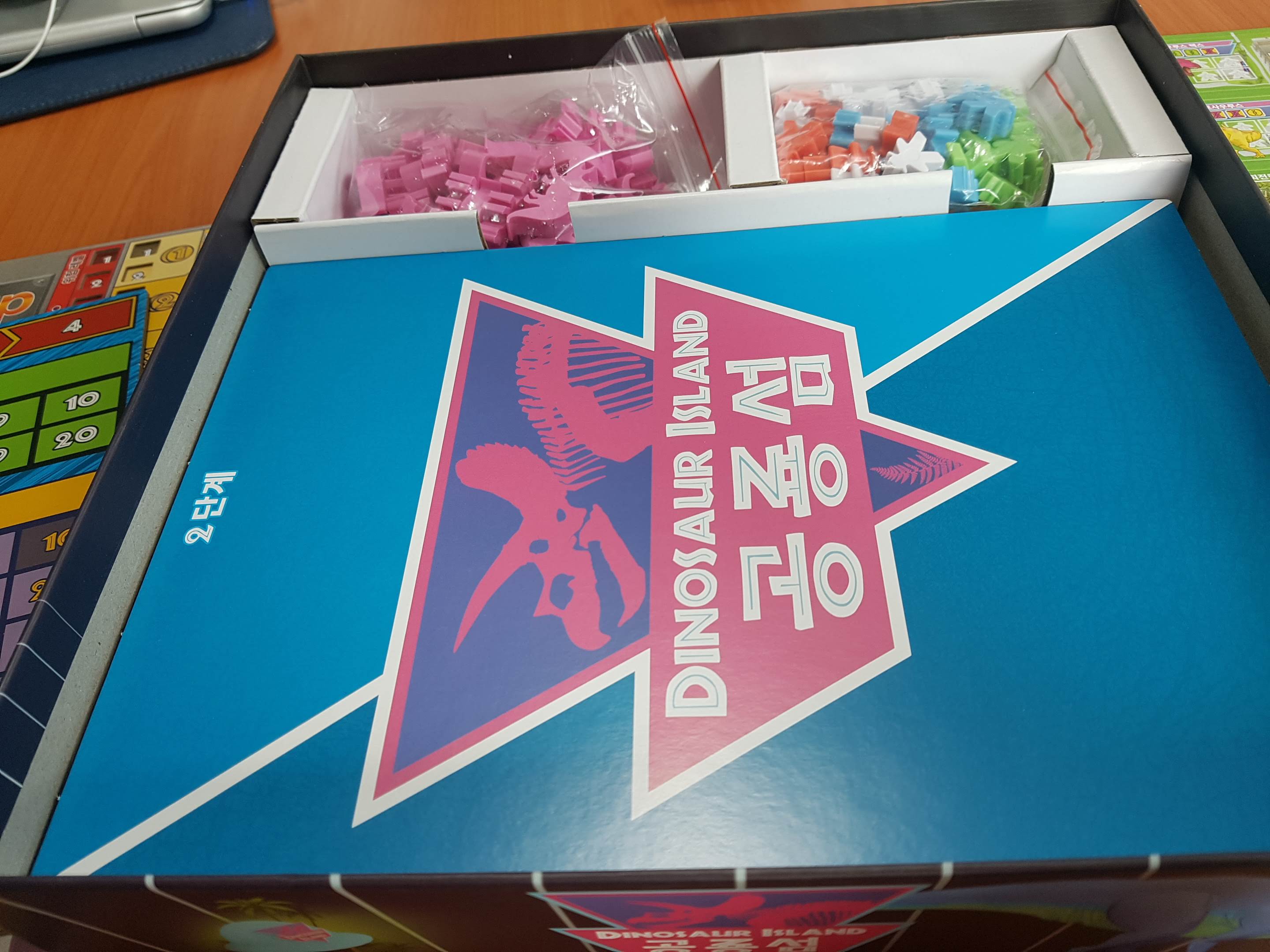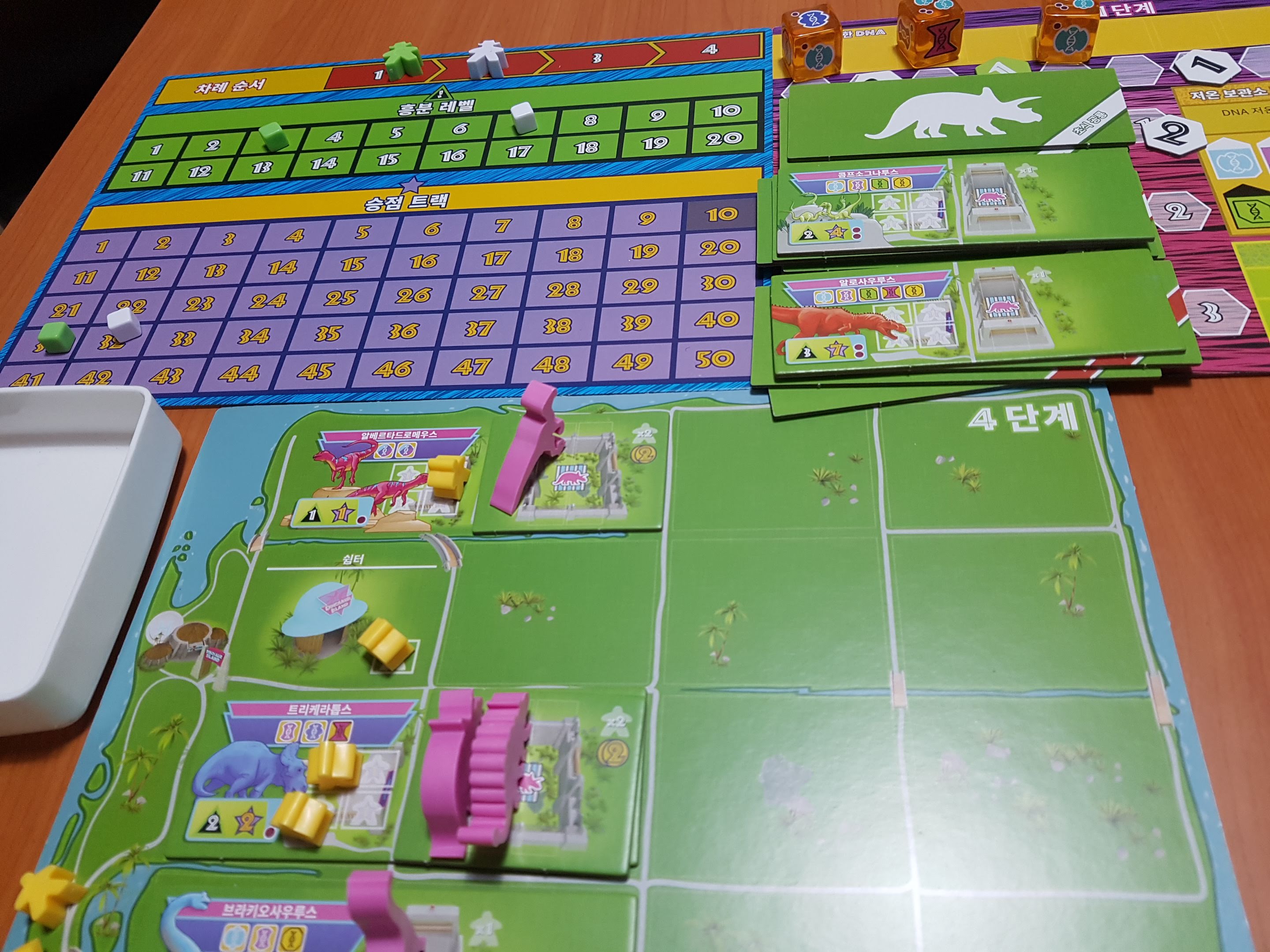 카드와 주사위 미플들이 보입니다. 기본공룡은 빼고 프로모 공룡을 넣었습니다. 둘다 넣으면 안들어갑니다.