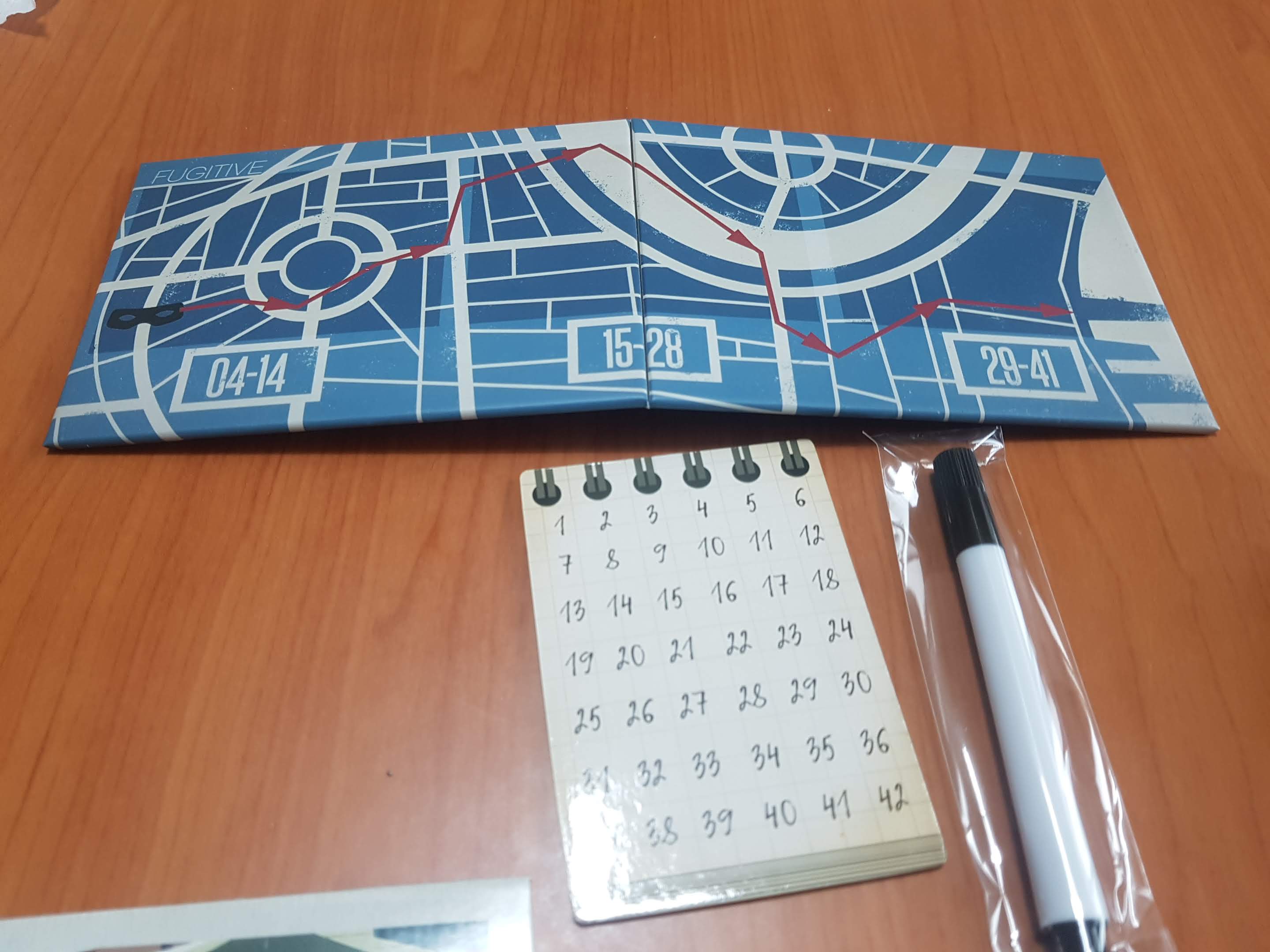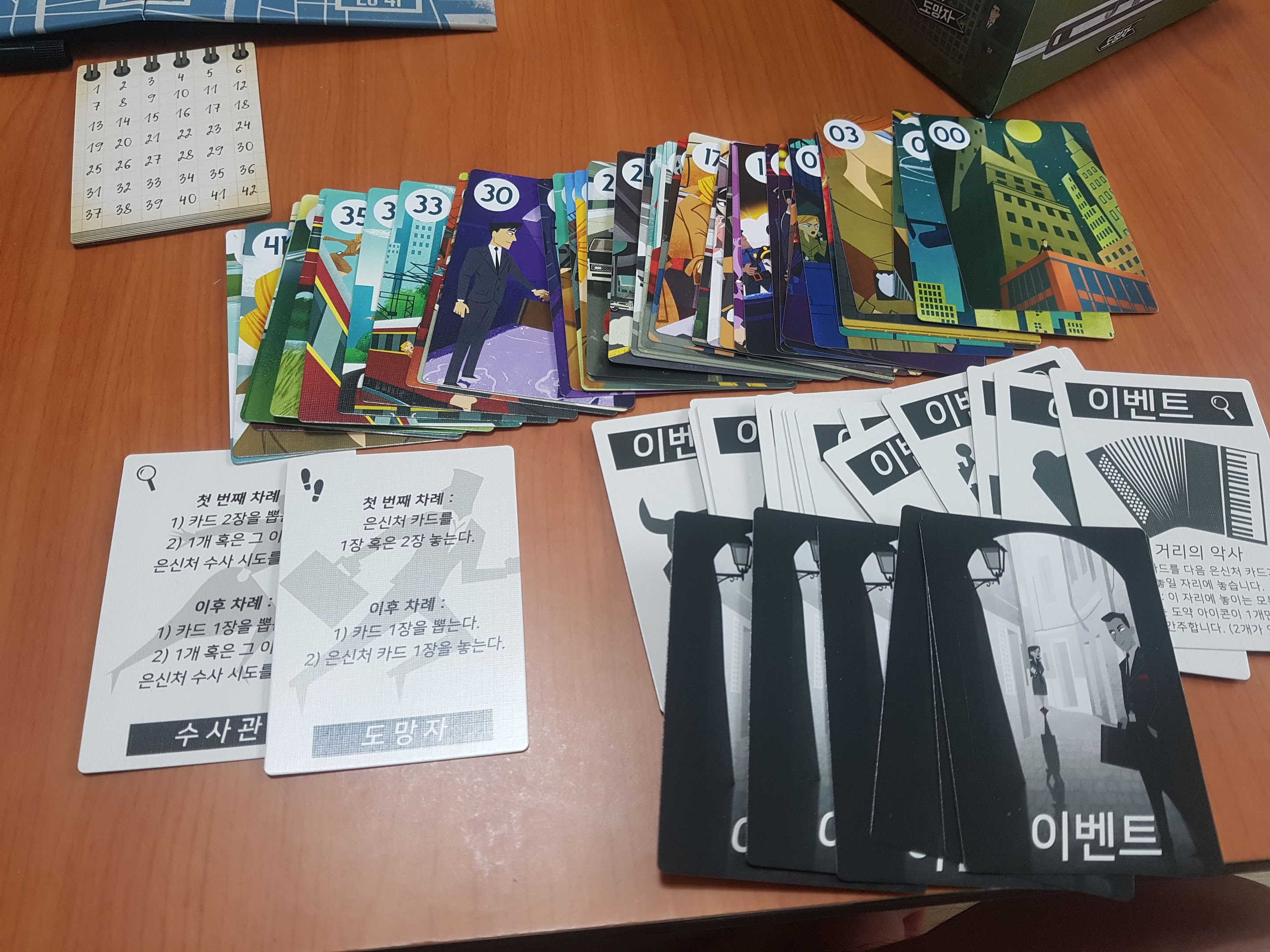 보드판은 카드들을 구분해서 놓는데 쓰이며 경찰수첩과 펜은 경찰이 추리를 하는데 쓸 수 있습니다.