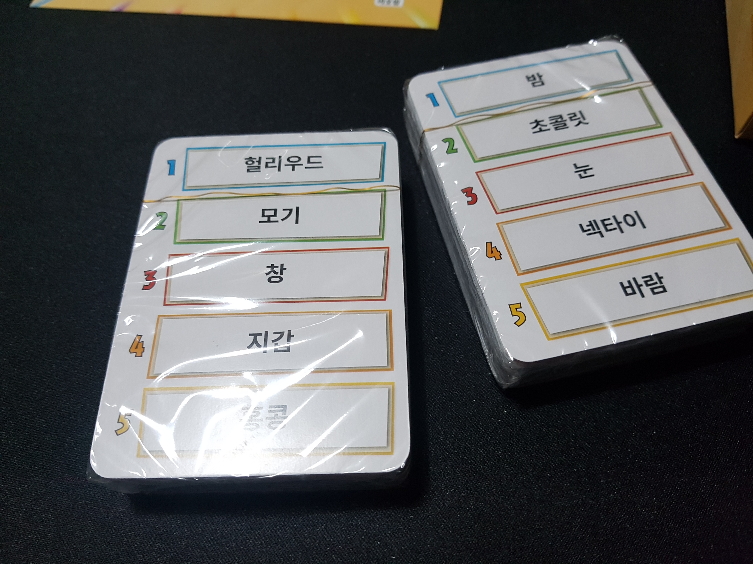 간단한 게임입니다. 단어를 맞춰야하는 사람이 카드를 보지 않고 1~5 중 숫자를 하나 외치면 그 숫자에 맞는 단어의 힌트를 다른 사람들이 내야하는 것이죠.