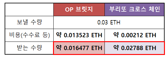 국내거래소 이용 기준, 10만원 정도 Op Eth를 얻고자 할 경우, Op 브릿지를 이용하는 것보다 부리또 월렛 크로스체인을 이용하는 것이 효율이 더 좋습니다. (전송 금액 규모에 따라 달라 질 수 있습니다. 항상 견적을 비교해보고 하시길 바랍니다.)