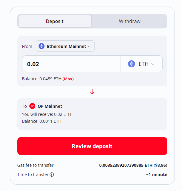 국내거래소 ETH 출금 수수료 0.01 + OP 브릿지 수수료 0.003523 ETH 가 든다고 합니다.