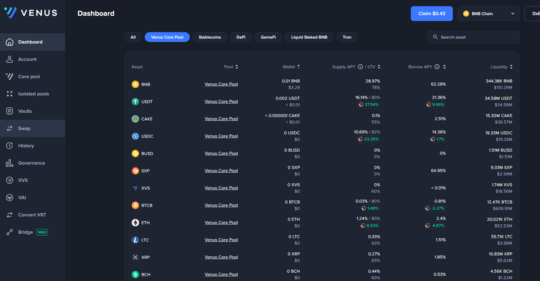 Venus 프로토콜의 Dashboard입니다. 기본적으로 대출플랫폼은 위와 같은 형태로 되어있습니다.