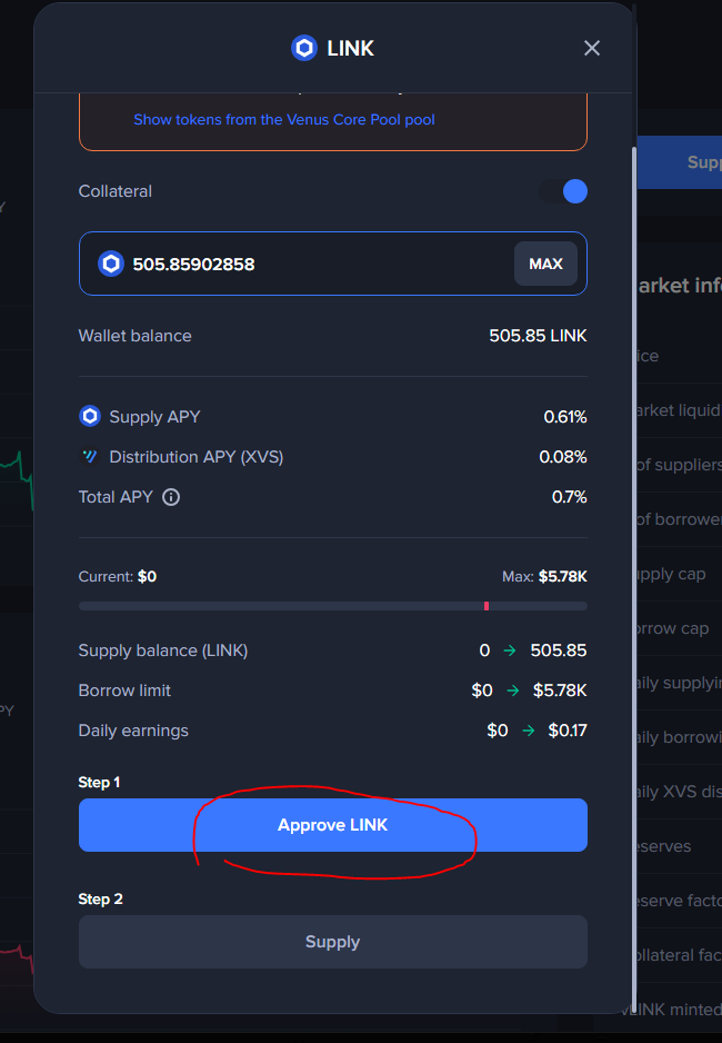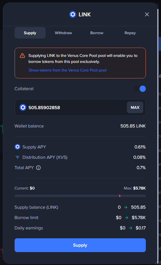 그리고 여기서 Collateral이 꺼져있으면 눌러서 켜주시길 바랍니다. 예치하는 코인을 담보로 이용할 것인지 설정하는 옵션입니다. 저는 Link를 담보로 USDT를 대출할 것이기에 Collateral를 켜주었습니다.