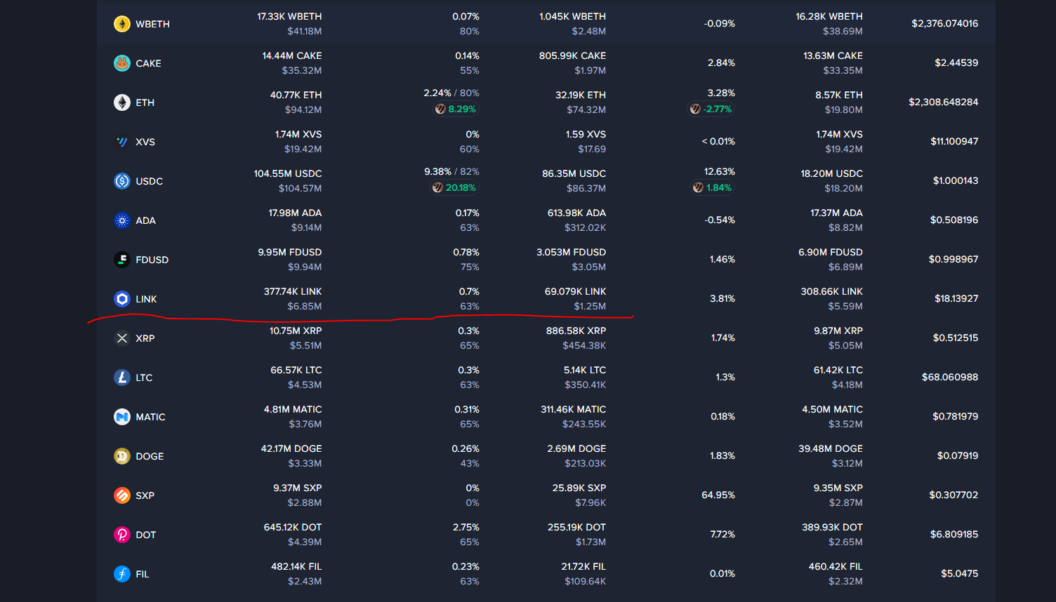 | 1. Link(체인링크)를 Venus 프로토콜에 예치한다. 2. Link를 담보로 USDT를 대출한다. 3. USDT로 xxx 코인을 산다. . . . 4. xxx 코인이 5배 오른다. 5. xxx 코인을 팔아 USDT를 갚는다. |