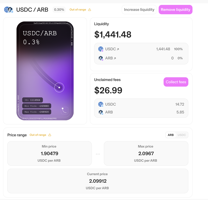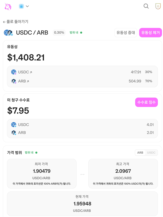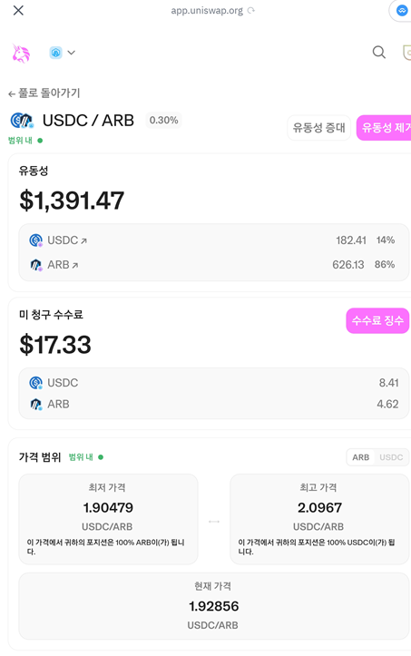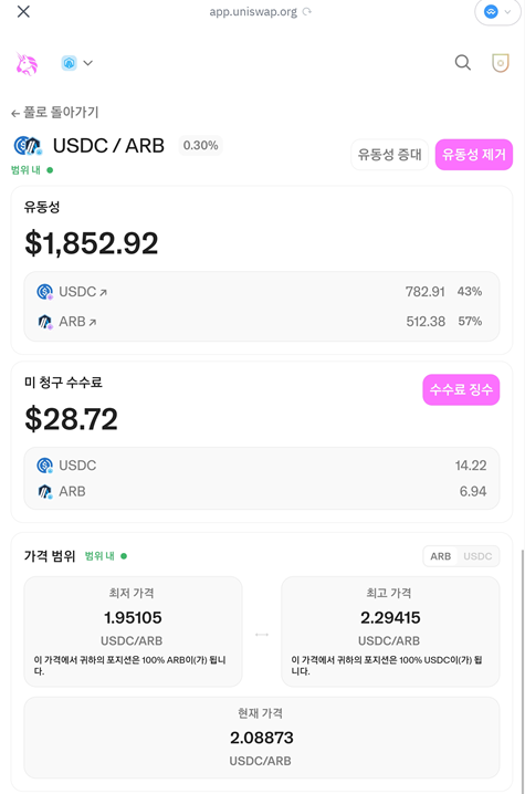 다만 범위가 벗어 날 때 포지션을 종료하고 다시 잡는 경우 아비트럼 체인의 경우 가스비도 1~2$ 정도 들어가므로 가격 범위를 잡을 때 이런 것도 고려해야 합니다.