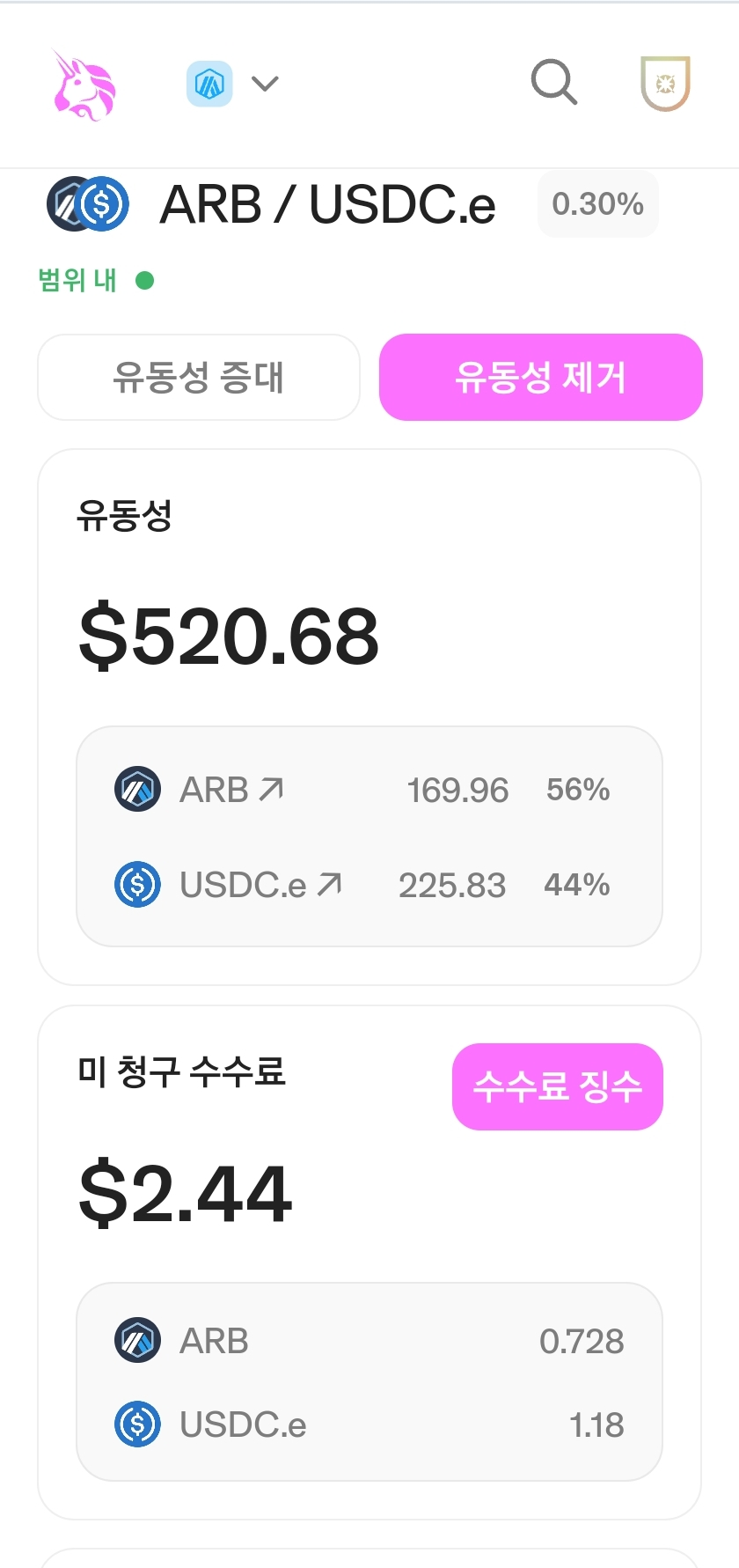 그리고 ARB이 쭉 상승한다고 생각하면 USDC도 ARB으로 바꿔서 가지고 있는게 수익이 많이 납니다. (비영구적손실 때문)