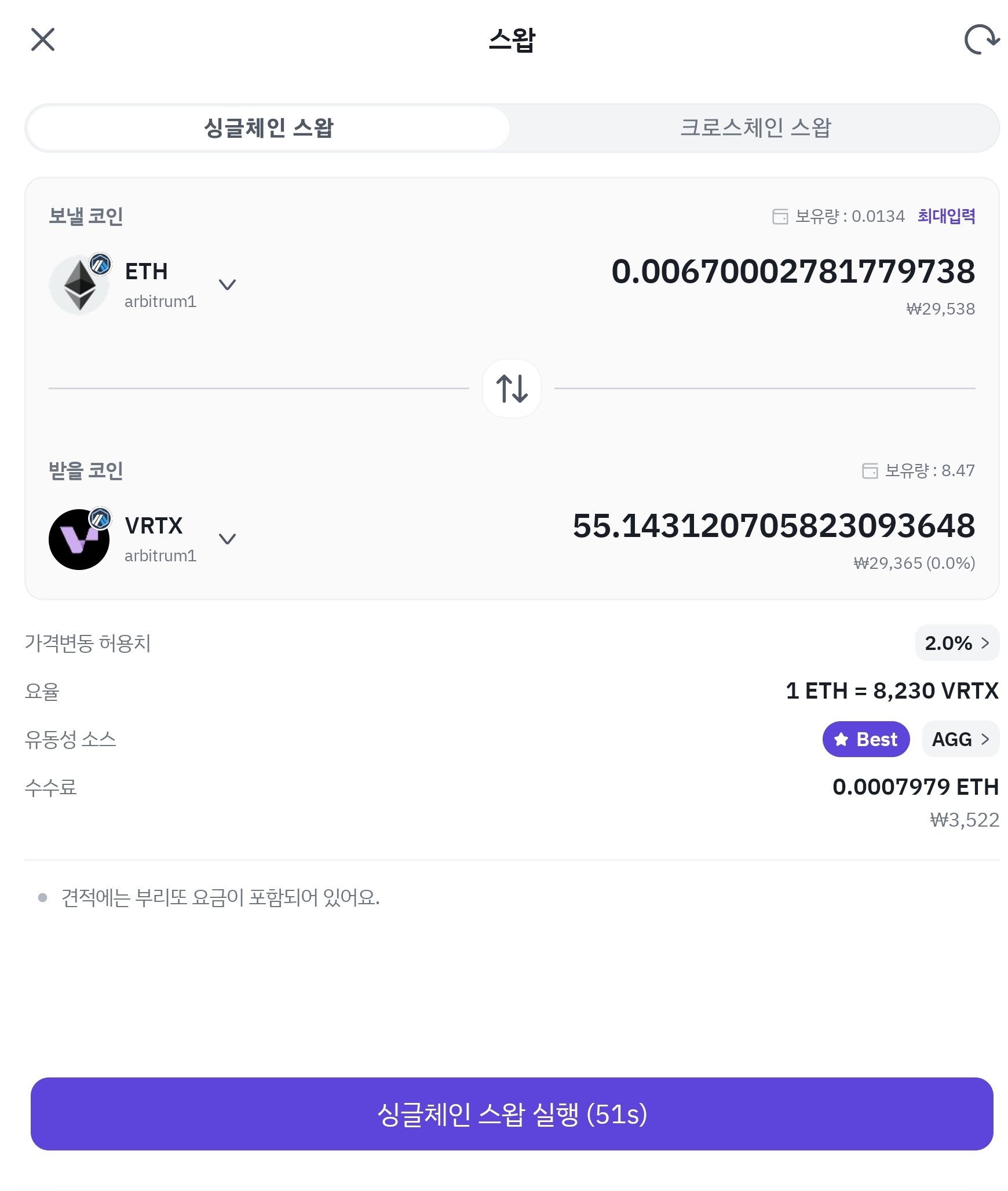 싱글 스왑에서 ARB 체인의 ETH로 VRTX 교환 견적을 받은 모습입니다.