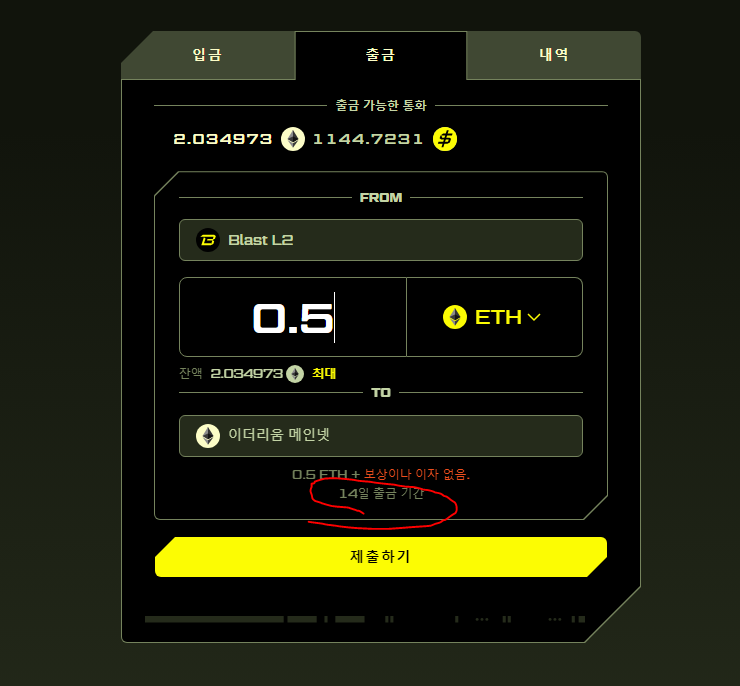 ETH 메인넷으로 출금할 때는 14일이 걸린다고 하네요.