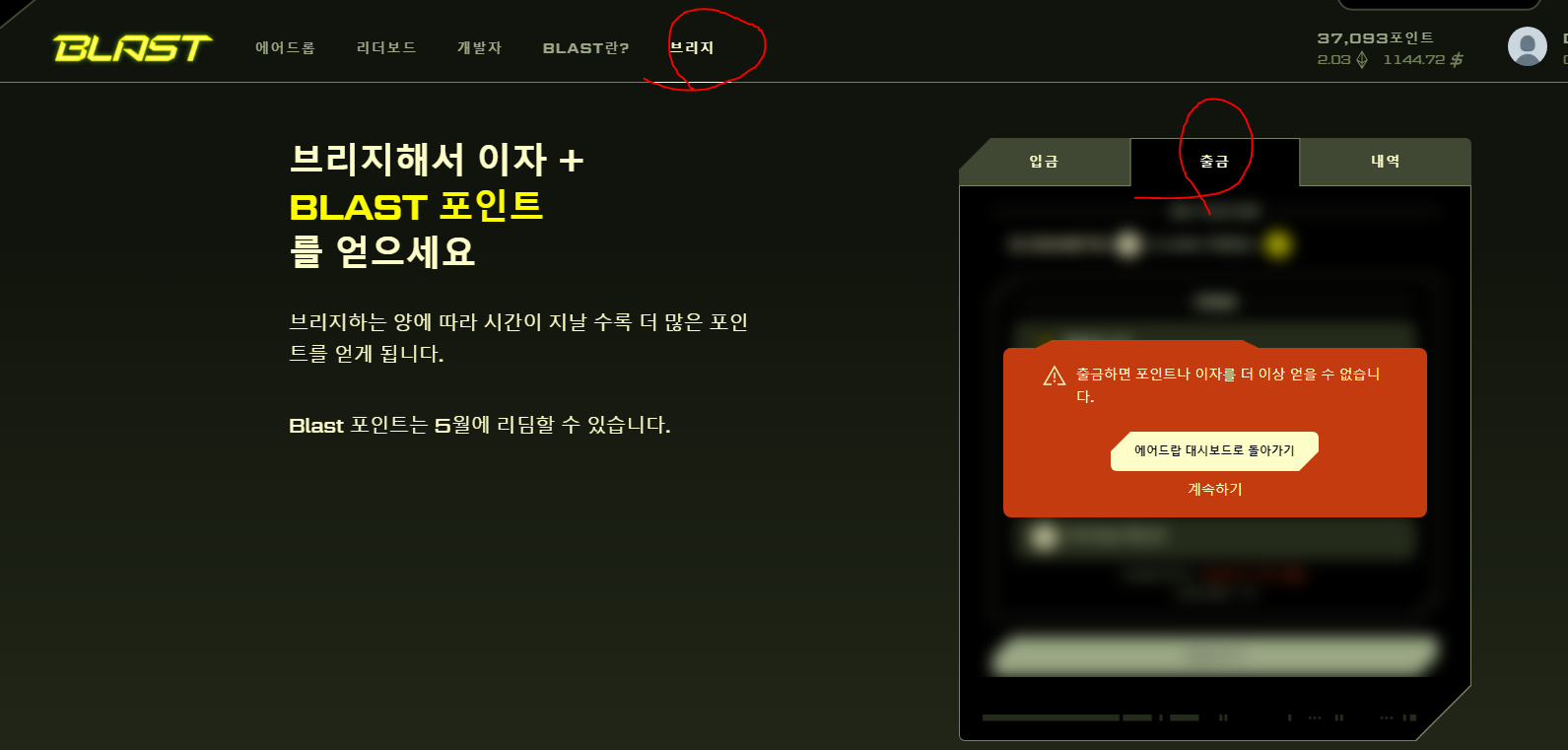 Blast 홈페이지에서 지갑을 연결 한 뒤, Blast 브릿지 탭에 들어갑니다.