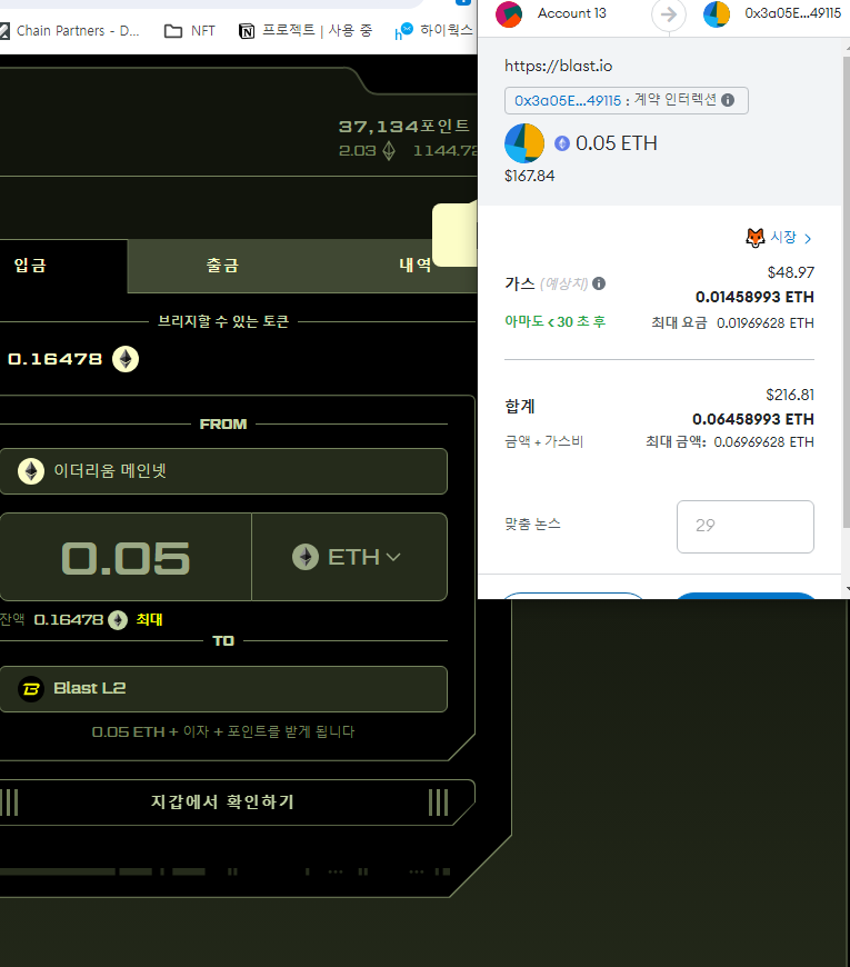 입금할 때는 출금과 달리 트랜잭션이 실행된 후 금방 Blast 메인넷이 들어옵니다.