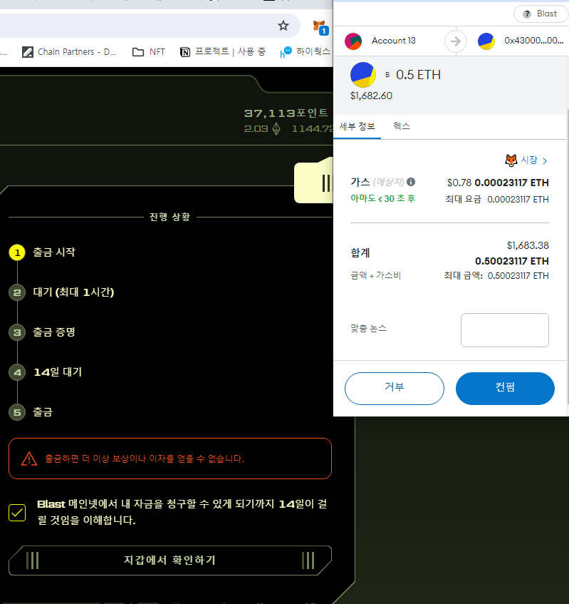 경고 문구를 체크하고 출금을 누르면 지갑에서 출금 트랜잭션을 실행 할 수 있습니다.
