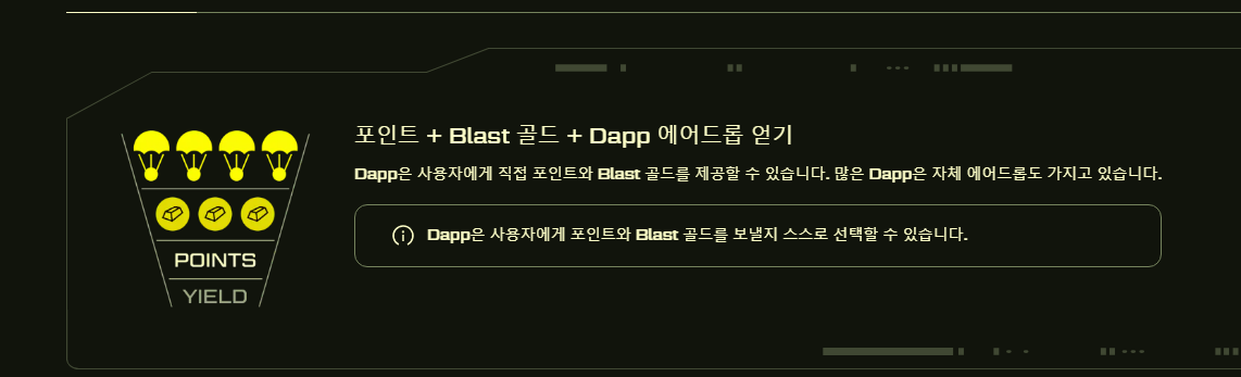 Native(ETH), Stable 의 YIELD(연이율)을 깔아주고, 그 위에 현재 BLAST 에어드랍 작업으로 불리는 POINT를 얻을 수 있고, 그 위에 각 종 Dapp들에서 얻을 수 있는 BLAST 골드를 얻을 수 있고, 마지막으로 각 Dapp들의 자기들의 에어드랍 혜택도 누릴 수 있다.