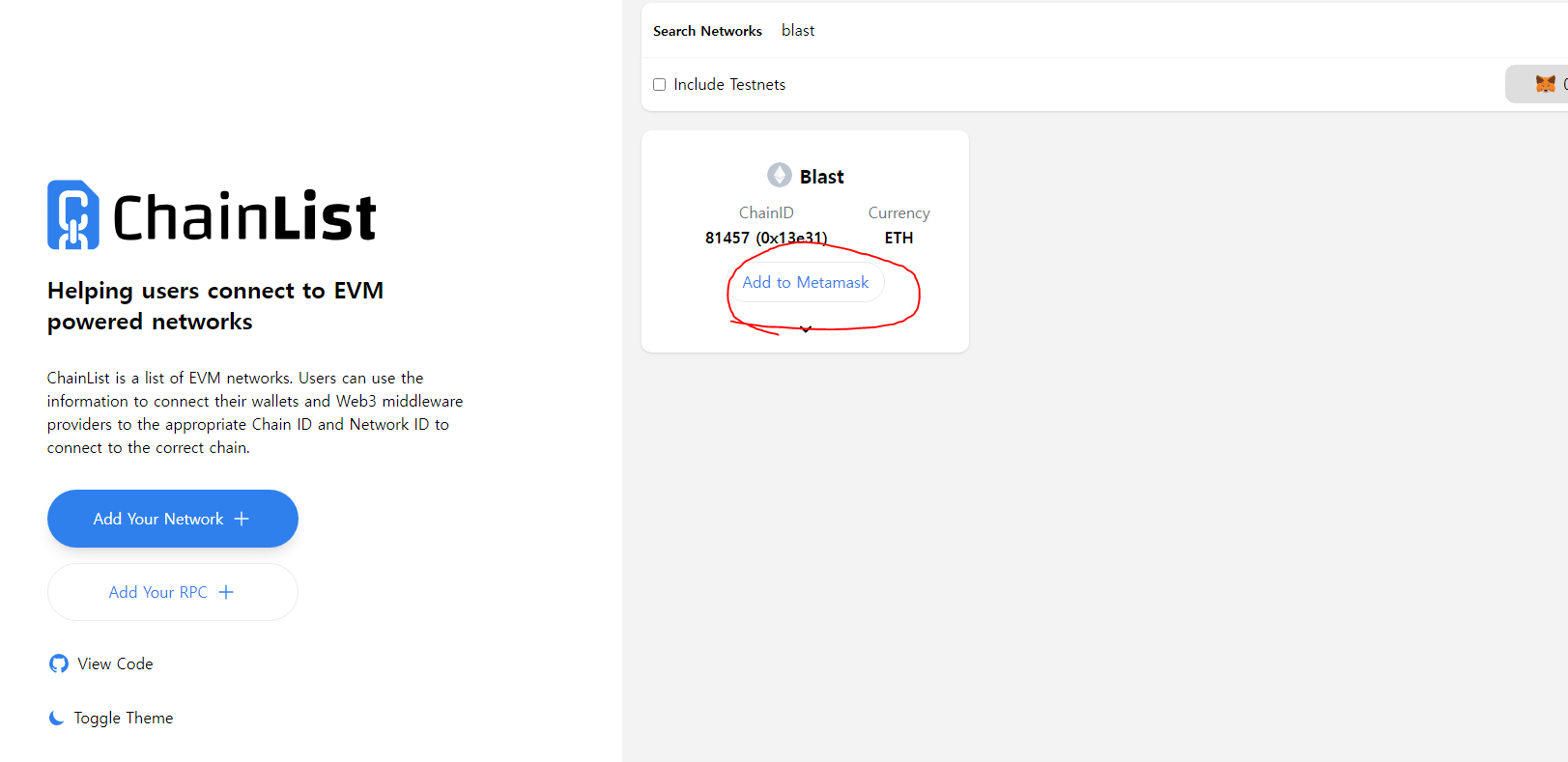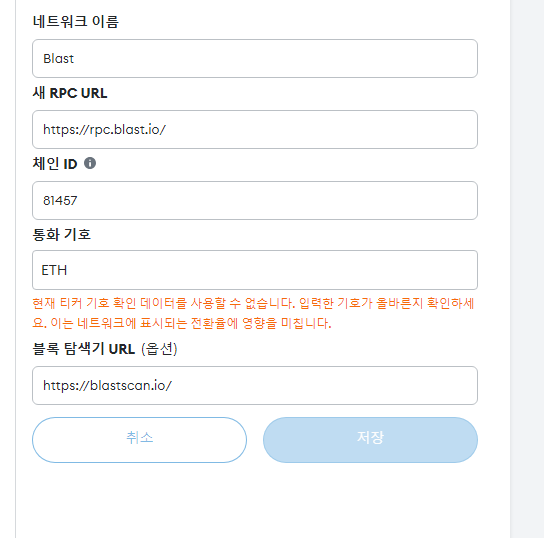 Blast 체인을 메타마스크에 추가하려면 다음을 입력해주면 됩니다.
