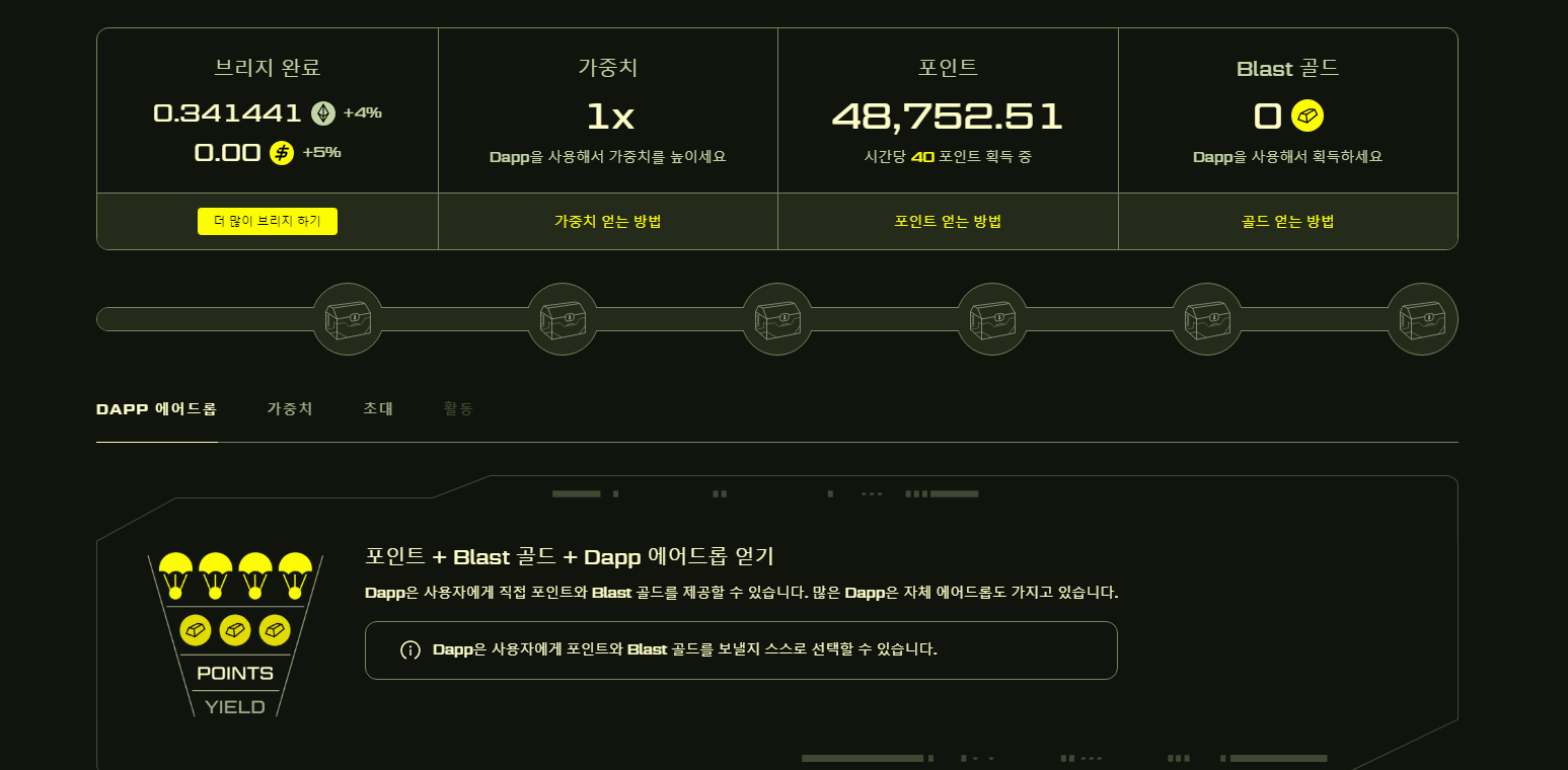 포인트도 받고, Dapp 을 이용해서 Blast 골드도 받고, 심지어 각 Dapp들이 토큰 등을 발행하면 그 에어드랍도 받을 수 있습니다.