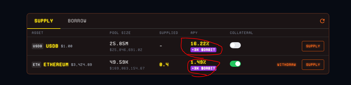 Dapp에 예치된 ETH, USDB의 이자 수익을 Dapp이 가져가는데, 그것을 유저들에게 돌려주는 것이 아니라, Orbit 토큰의 가치를 부양하는데 쓰인다고 합니다.