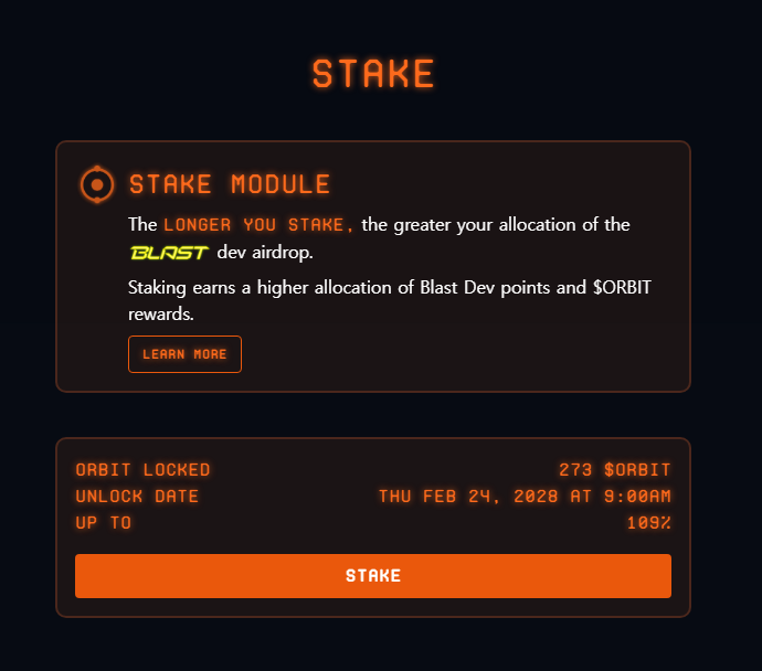 이 프로토콜에서는 Blast gold를 ORBIT 스테이킹 한 사람들에게 나눠준다고 합니다. 더 오래 스테이킹 할수록 많이 보상을 받을 수 있다고 하네요. 그리고 Orbit 토큰도 보상으로 받습니다.