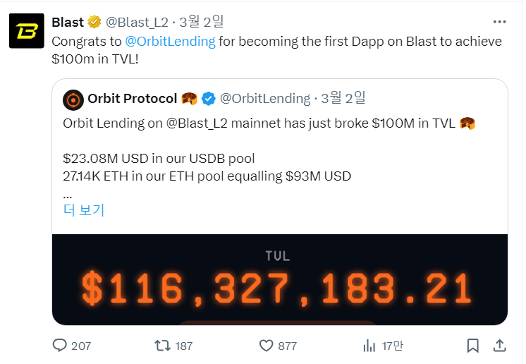Blast 공식 X 계정에서 dapp들 중 처음으로 100m TVL 달성했다고 축하한다고 글을 작성했더군요.