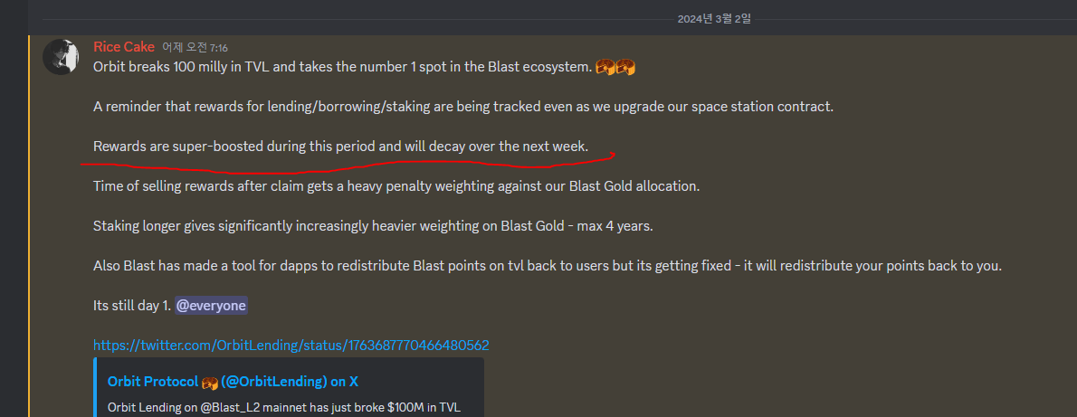 현재 Orbit 플랫폼 사용시 (예치, 대출, 스테이킹) 보상으로 Orbit 토큰을 주는데, 현재 부스트 기간으로 더 주고 있는 것 같습니다.