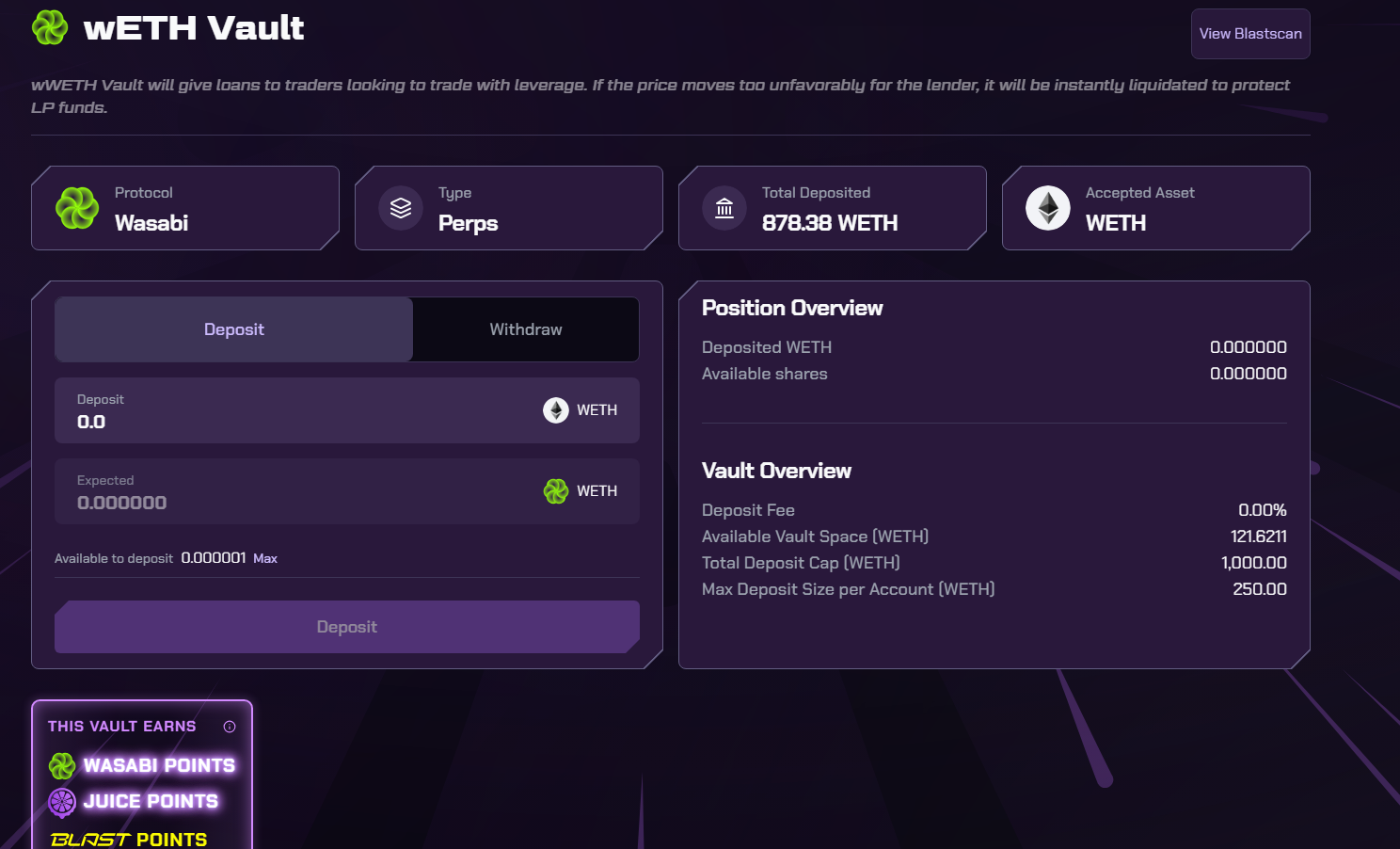 이것은 WETH를 Wasabi에 예치하는 것입니다. USDB vault에서 wasabi에 예치하던 vault와 같은 방식입니다.